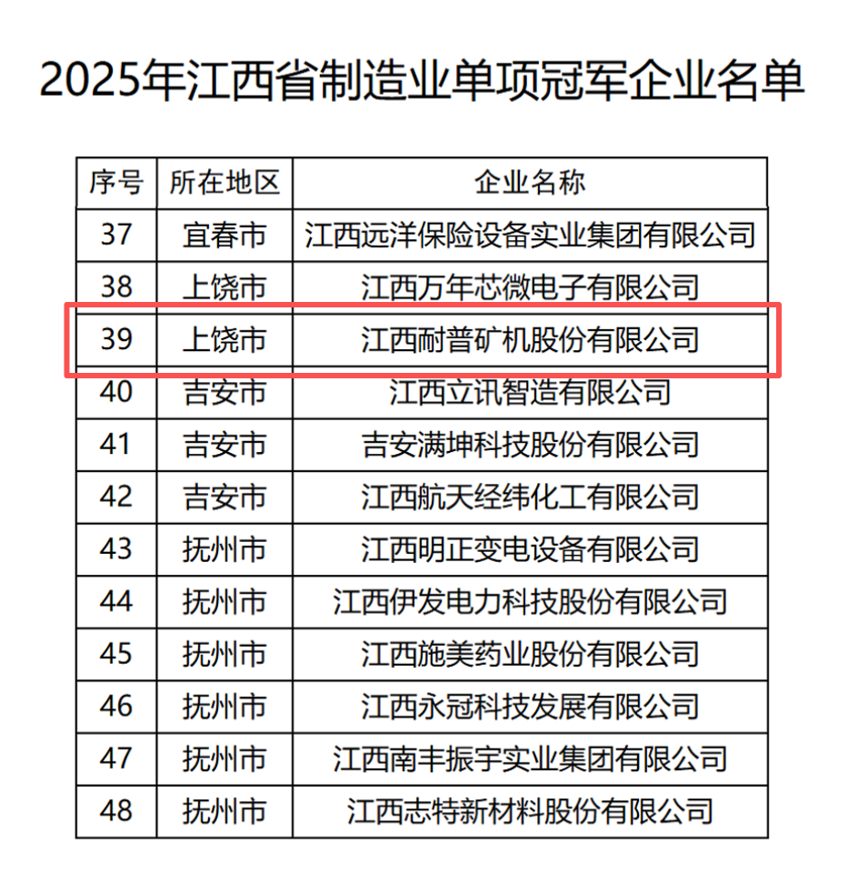 我司江西耐普矿机股份有限公司入选
